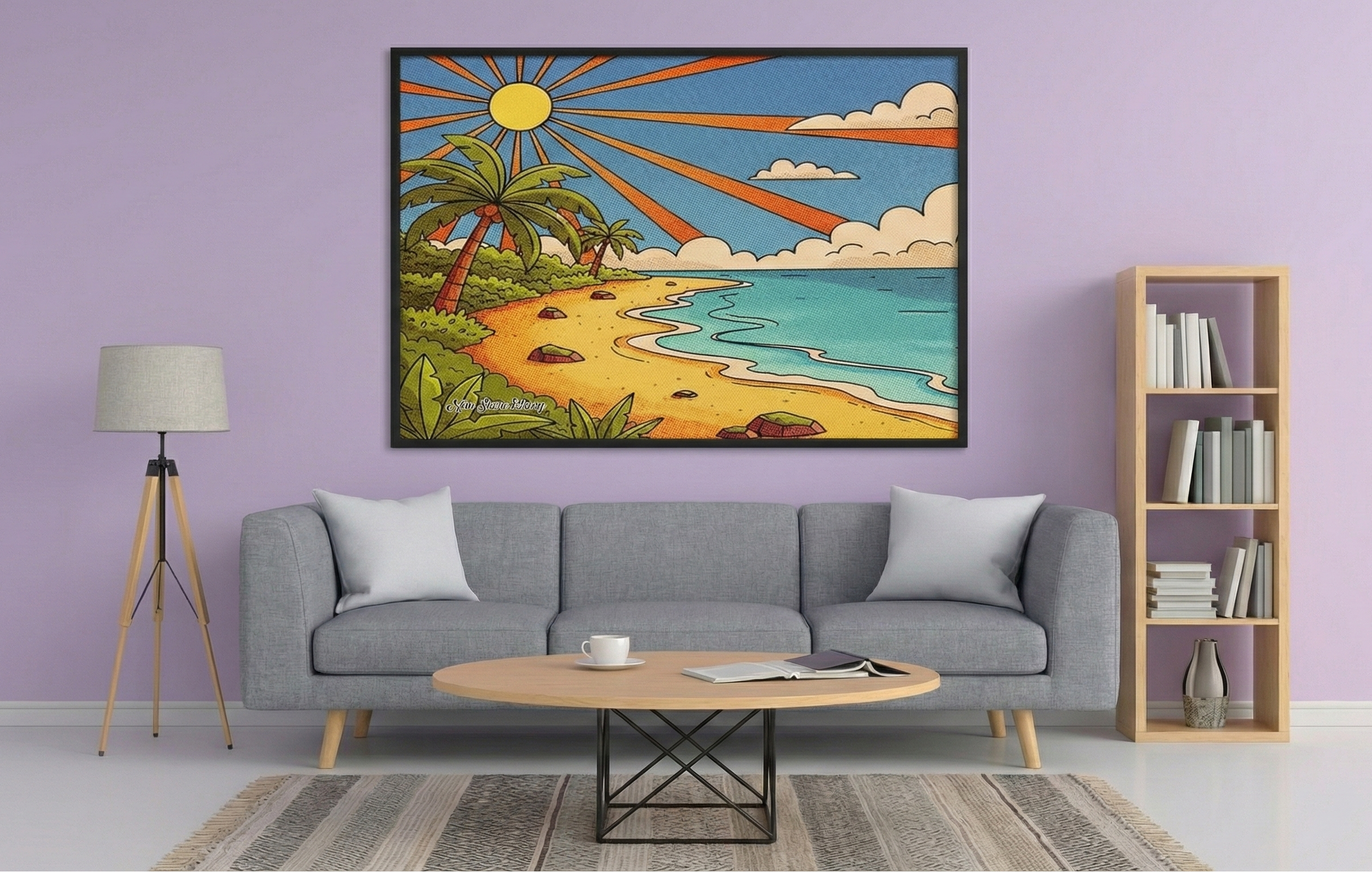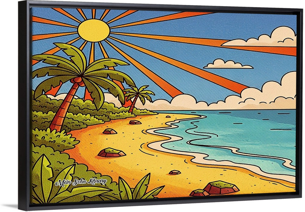 “Endless Summer” captures the joy of sunlit shores and carefree days by the sea. Radiant rays stretch across a vibrant sky, illuminating palm trees, warm sand, and gentle waves. With bold pop-art textures and uplifting color, this artwork brings happiness, energy, and a timeless vacation feeling into any space.