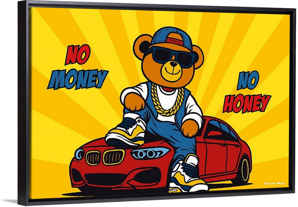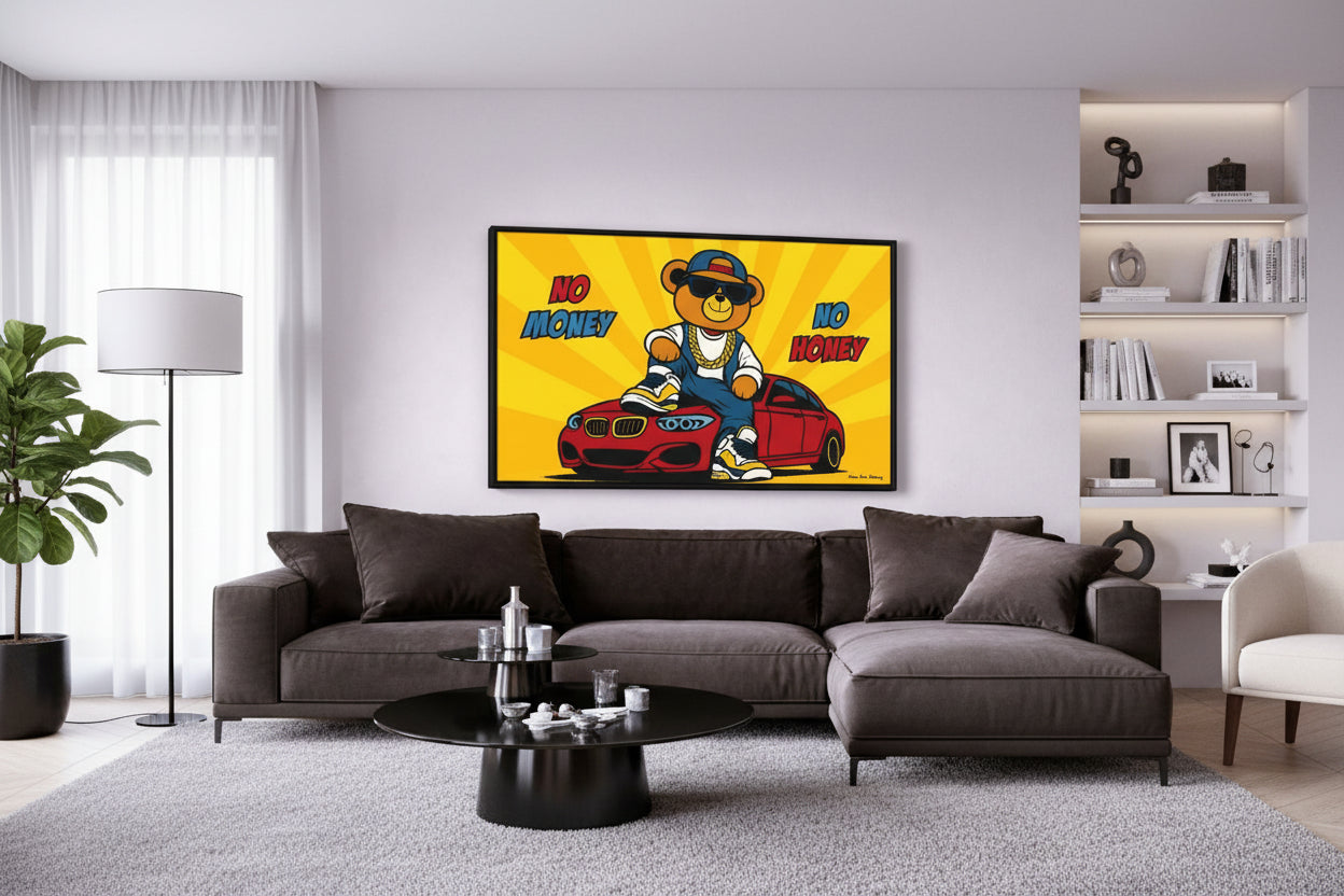 “No Money, No Honey” delivers a bold statement with playful confidence. A stylish bear, luxury car, and vibrant colors combine pop-art energy with modern hustle culture. Designed to spark motivation and attitude, this artwork is perfect for offices, studios, man caves, and modern interiors that celebrate ambition and success.