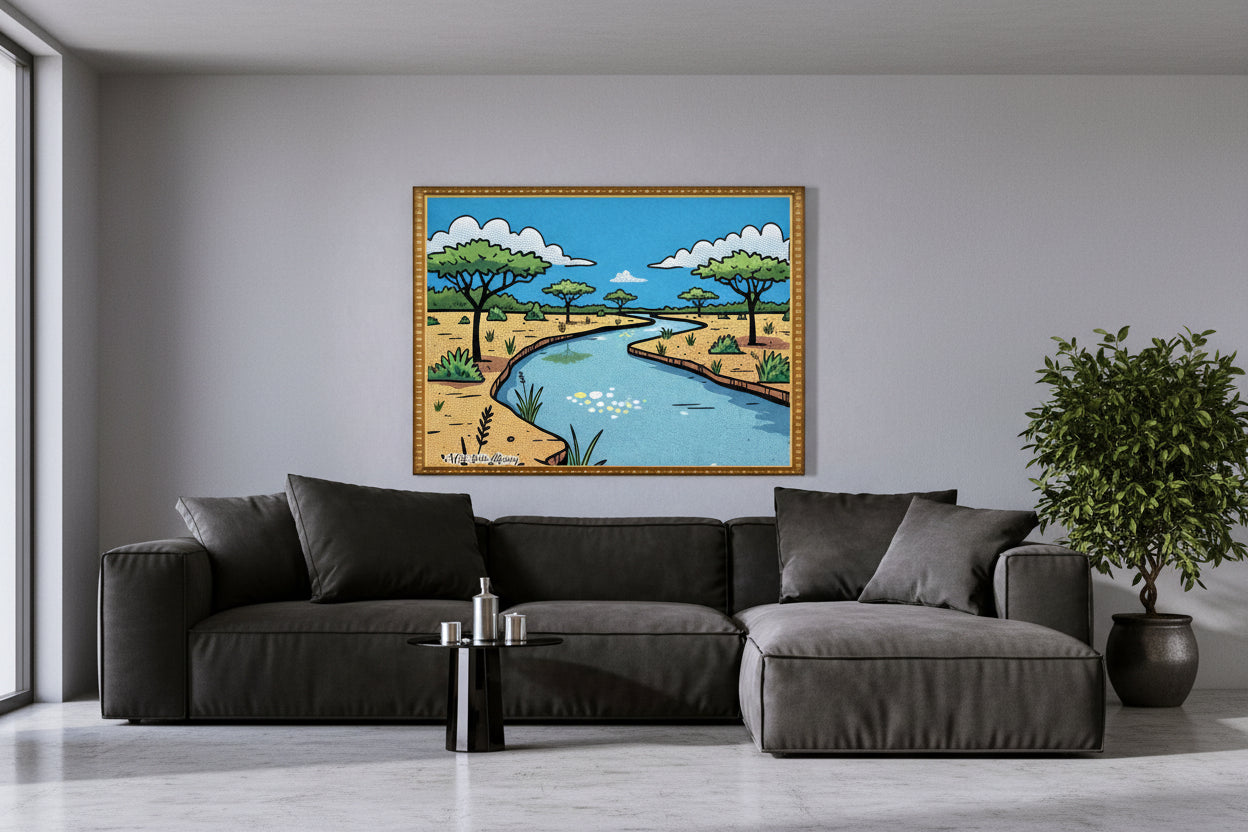 Bring calm and tranquility into your home with ‘Riverside Serenity’ from Mein Sohn Library. This elegant framed art print captures the beauty of a peaceful river flowing through the savanna, surrounded by nature’s quiet charm. Fully framed and ready to hang, it’s a perfect addition for those who love the outdoors and scenic simplicity.