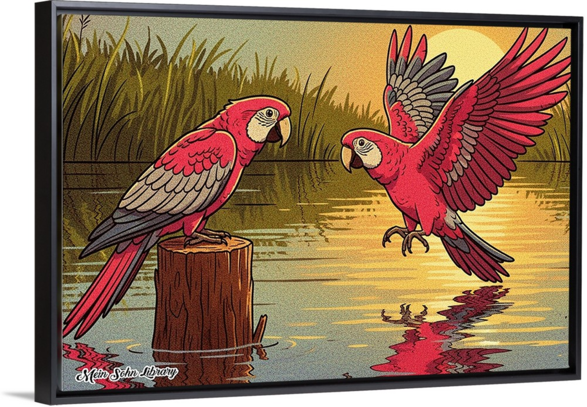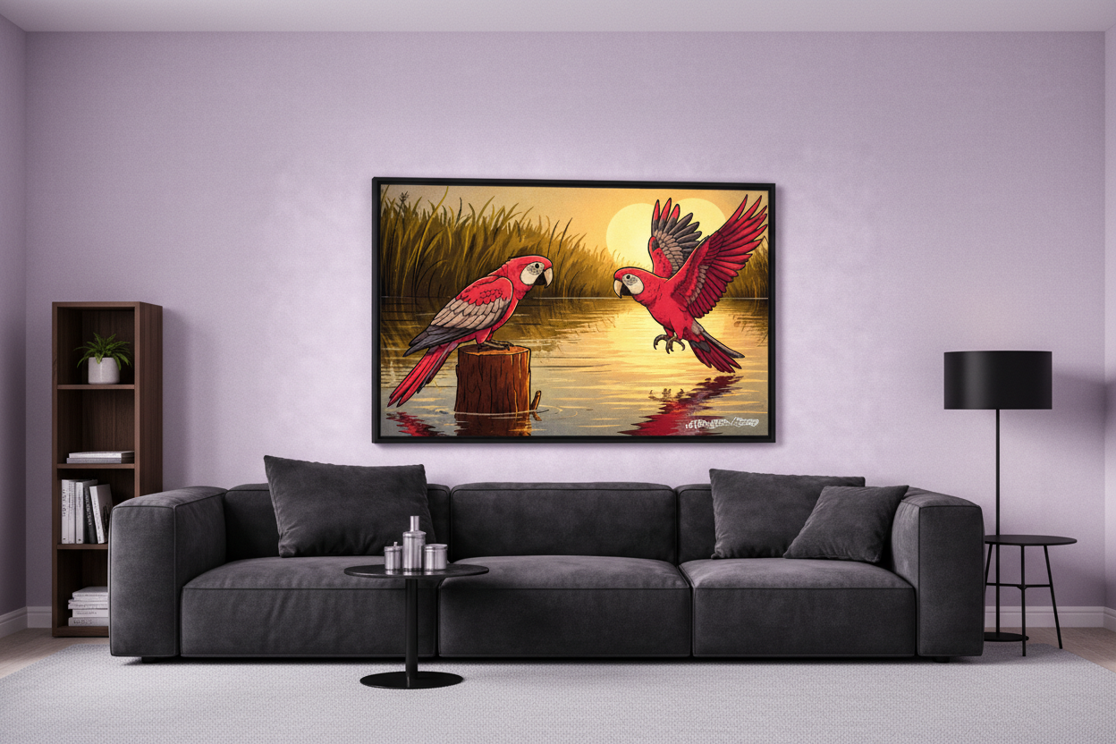 Experience the warmth and vibrance of nature with ‘Sunset Parrot Harmony’ from Mein Sohn Library. This stunning framed art print showcases two vivid parrots by the water at sunset, creating a peaceful and captivating visual centerpiece. Printed with high‑quality inks and framed in a modern black frame, this artwork is ready to elevate any room.